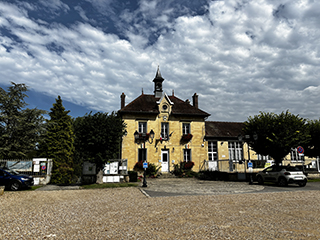 The present town hall–school was built in 1906, as indicated by the date engraved on its pediment. Facing a square planted with lime trees, the town hall building rises on two floors plus an attic level, and is attached to the single-story school building. The whole complex follows the model of town hall–schools of the French Third Republic, which spread across France from the end of the 19th century. These dressed-stone buildings, designed to glorify the state authority, feature recurring elements. For example, the small bell tower on the roof of the Ableiges town hall is a common decorative feature. The building also has some architectural specificities, probably linked to its later construction, in particular its central dormer with a round window called ‘oculus.’ Still in use today, the town hall remains a central landmark of the village