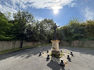 The cast-iron cross now standing at the centre of the crossroads is not the original and has slightly changed position. This highly ornamental model of cross dates from the late 19th century and was restored in 2021. The shaft of the cross is pierced with vine-scroll motifs, which in religious iconography refer to the blood of Christ shed during the Passion. The ends of the cross are decorated with finials, and the crucified Christ is surrounded by a halo of light. The appearance of the previous cross is unknown. Although it now stands in the middle of the crossroads, old postcards show that it once stood along the embankment. Today, the cross marks the entrance to the path reopened by the commune between Ableiges and La Villeneuve-Saint-Martin.