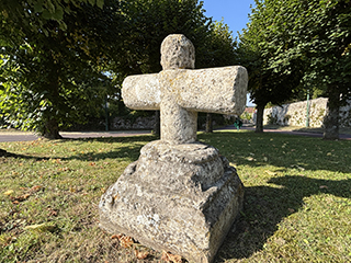 This small stone wayside cross rests on a base composed of an inverted column capital, probably reused from an earlier architectural element. The shaft of the cross may have been shortened, which would explain its small size. The dating of the cross is estimated between the 13th and 15th centuries; the lack of detailed information accounts for this uncertainty. The cross marks the southern entrance to the village, at the junction with the Route des Crêtes, which links La Roche-Guyon to Villers-en-Arthies.